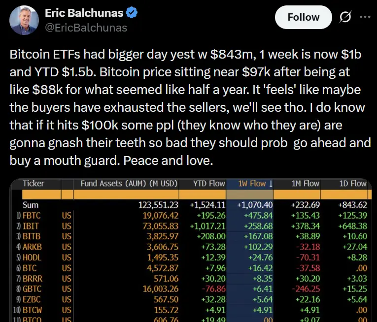 قال بالتشوناس في منشور على X إن نمط الطلب على ETF “يُشير إلى أن المشتريين ربما استنفدوا البائعين”، في إشارة إلى اختراق البيتكوين من حالة التوحيد المطول حول مستوى 88,000 دولار.