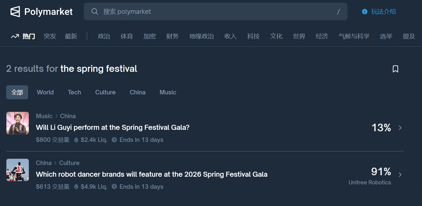 深潮 TechFlow消息,2 فبراير، وفقًا لصفحة الموقع الرسمي، منصة سوق التوقعات للعملات المشفرة Polymarket أطلقت سوق توقعات حول حفل عيد الربيع الصيني. يتضمن ذلك: واحد حول ما إذا كانت شركة Unitree Robotics ستقدم عرض رقص بالروبوتات في حفل الربيع لعام 2026، حيث يُظهر الاحتمال الحالي 91٪؛ وآخر حول ما إذا كانت المغنية لي غو يي ستؤدي في الحفل، حيث الاحتمال الحالي 13٪.