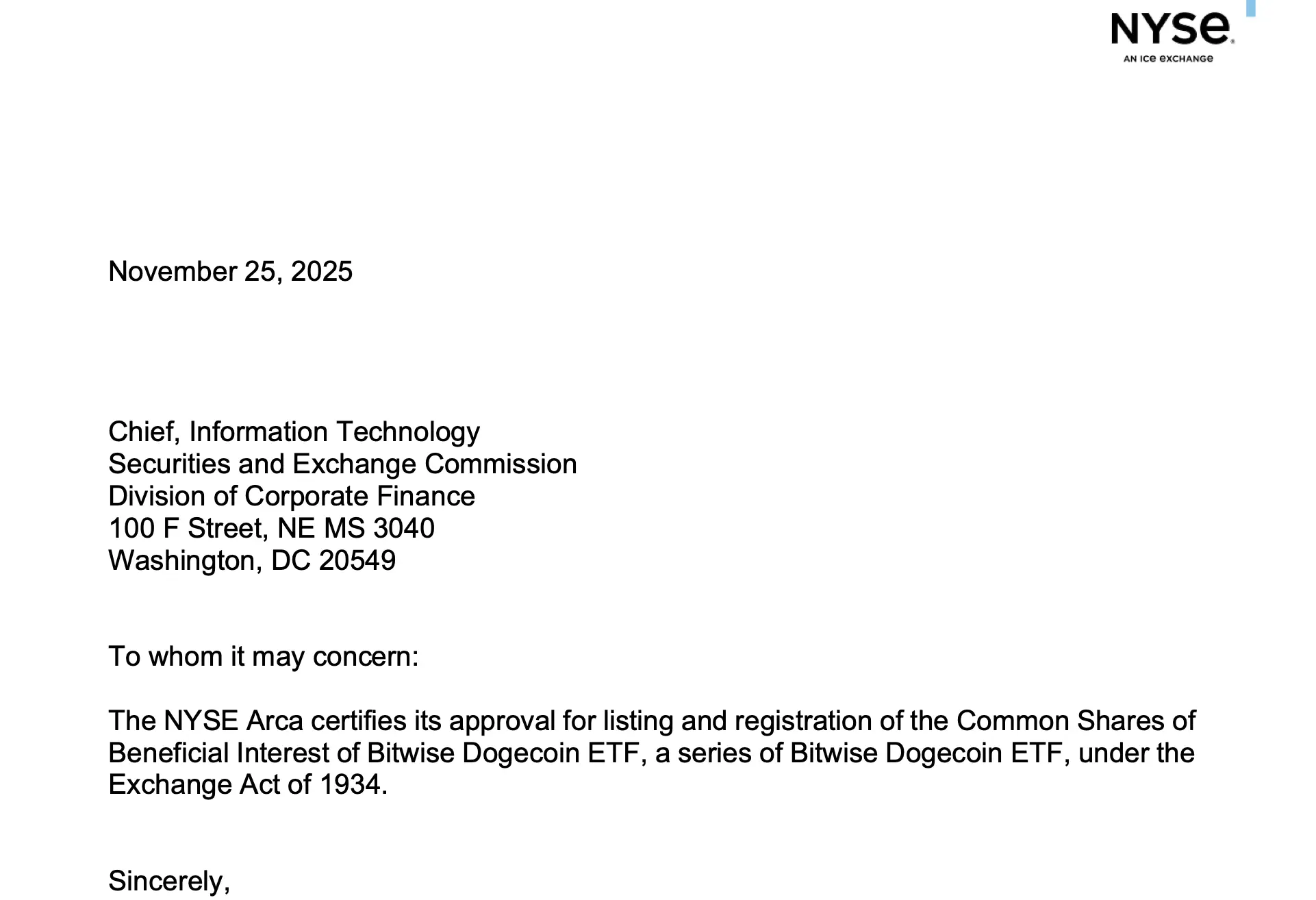 Fuente: ETHNews Título Original: ETF de Dogecoin de Bitwise comenzará a cotizar en NYSE Arca Enlace Original: El ETF de Dogecoin de Bitwise ha recibido la aprobación de listado de NYSE Arca, allanando el camino para que las operaciones comiencen bajo el símbolo BWOW el miércoles 26 de noviembre de 2025. La luz verde llega solo dos días después del debut del ETF de Dogecoin de Grayscale (GDOG), que vio solo una actividad limitada en su primer día, una prueba temprana del apetito del mercado por los ETFs de monedas meme.