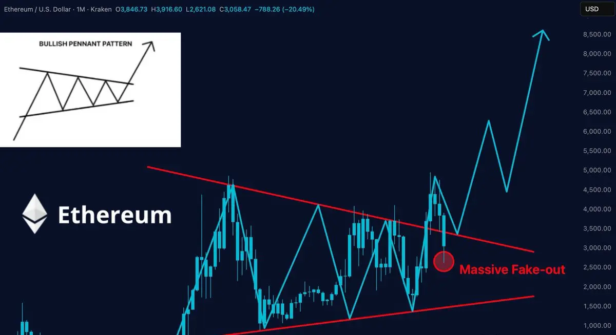 Le graphique de Merlijn montre qu'Ethereum a récemment chuté en dessous de la limite inférieure du drapeau dans ce qu'il qualifie de “faux signal massif.” Ce dernier shakeout est significatif car il représente souvent le dernier point où les mains faibles sont éliminées avant qu'une nouvelle tendance à la hausse ne commence. Son chemin projeté montre un rallye abrupt, avec les cibles supérieures grimpant vers la zone de 7 000 $–8 000 $ une fois que l'élan prend le relais.