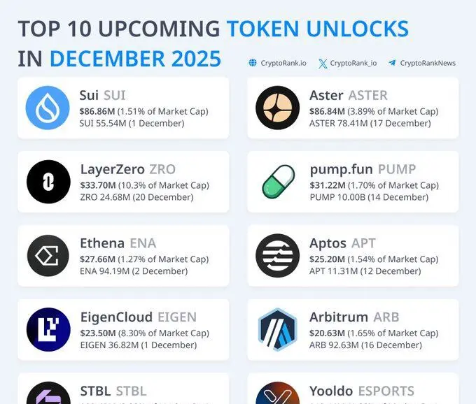 L'ampleur et la diversité des déblocages à venir font de décembre 2025 l'un des mois les plus importants en matière d'offre de l'année, et la réaction du marché à ces libérations pourrait influencer les trajectoires de prix début 2026 sur plusieurs grands réseaux blockchain.