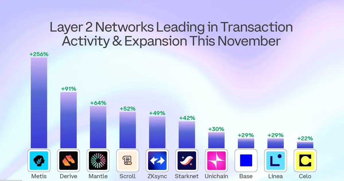 Metis, Derive et Mantle mènent la vague de croissance de novembre sur Layer-2 alors que l'activité s'accélère.