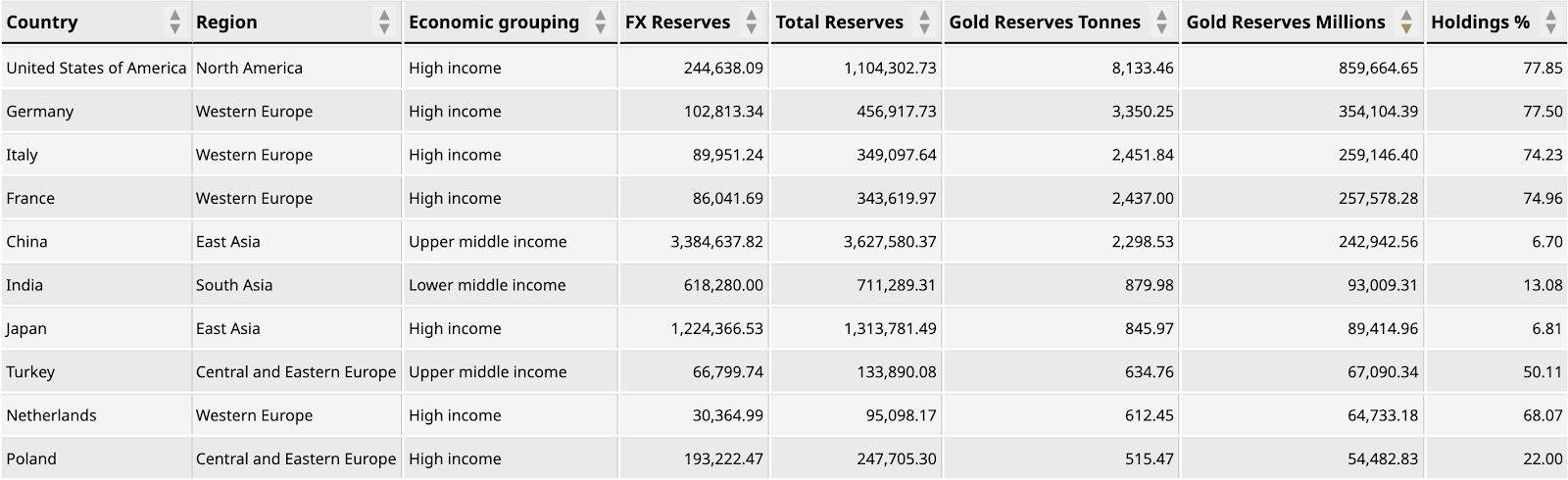 Amerika Serikat menempatkan 77,85% cadangannya dalam bentuk emas, dengan total 8.133 ton—jauh di atas Jerman yang berada di posisi kedua dengan 3.350 ton, diikuti Italia dan Prancis masing-masing 2.452 dan 2.437 ton.