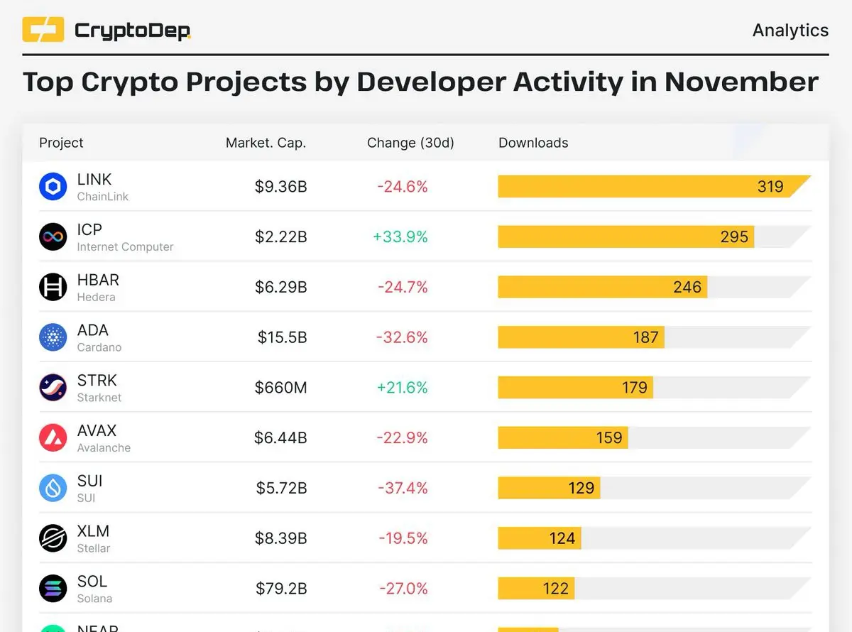 Chainlink Memimpin Aktivitas Pengembang di Bulan November Sementara ICP dan Starknet Mendapat Momentum