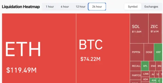 Total likuidasi tercatat 274,21 juta dolar, turun 46,32% dari hari sebelumnya. Likuidasi Ethereum sebesar 119,49 juta dolar, lebih tinggi daripada Bitcoin yang sebesar 74,22 juta dolar. Dari total likuidasi Ethereum, 82% berasal dari posisi short. Sementara pada Bitcoin, proporsi likuidasi long/short adalah 38%/62%.