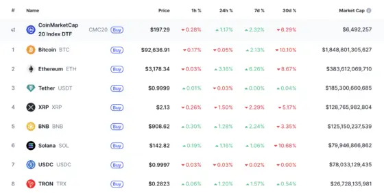 Menurut CoinMarketCap, harga Bitcoin dalam 24 jam terakhir turun 0,05% menjadi 92.637 dolar. Ethereum(ETH) naik 3,16% harian menjadi 3.178 dolar.
