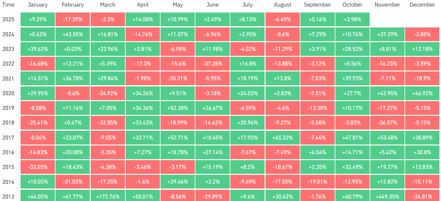 ビットコインは、データによると、10月に約20%、11月に46%、12月に約4%の歴史的な月間リターンを平均している。