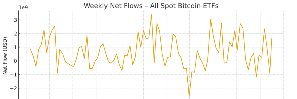 米国の現物ビットコインETFは先週に16.3億ドルを追加し、過去4週間の純流入額は39.6億ドルに達し、過去12週間のうち9週間がプラスとなりました。