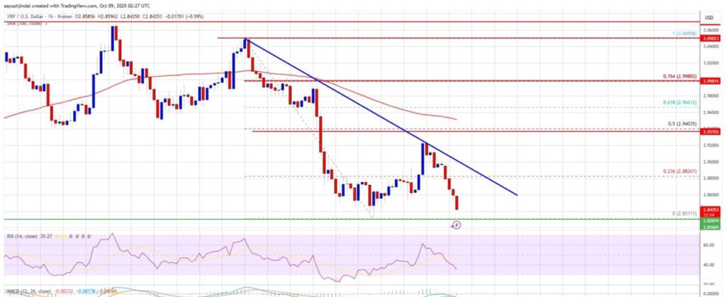 しかし、Ripple (XRP)が$2.92の抵抗ゾーンを突破できない場合、価格は再度下落する可能性があります。最初のサポートは$2.82にあり、その後$2.80に重要なサポートがあります。それを下回ると、$2.7250に向けてさらなる下落を引き起こす可能性があり、売り圧力が続く場合、価格は$2.65または$2.60ゾーンまで下落する可能性があります。