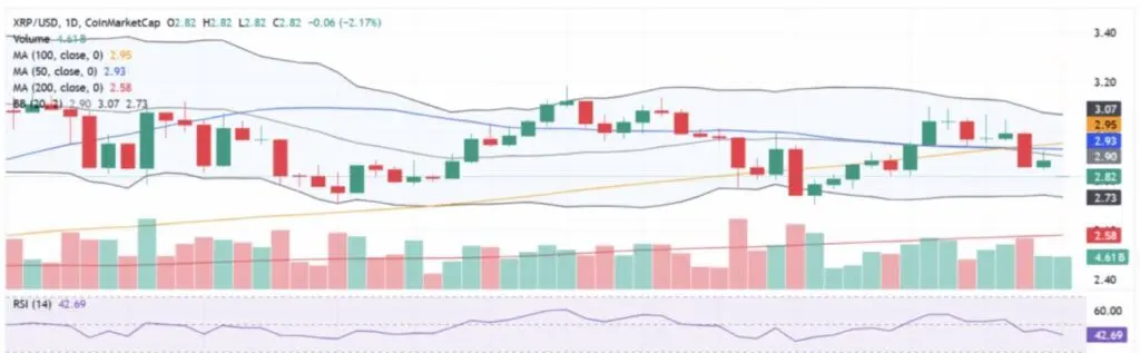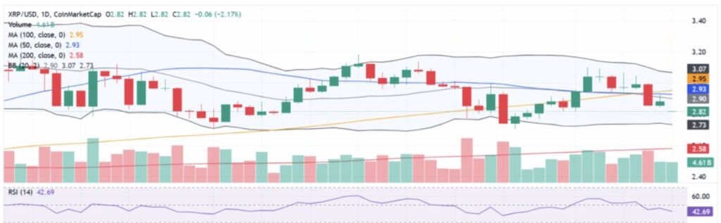 しかし、もし価格が$2.80を下回ると、さらなる修正に備えて多くのトレーダーがすでに準備を進めているため、急激な下落が起こる可能性があります。現在、MA-50ラインはMA-100を下回っており、XRP価格のモメンタムの弱さを示す信号を強化しています。