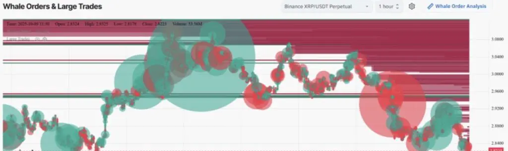 2025年10月9日現在、XRPの価格は2%以上下落し、現在の取引価格は$2.82で、日々の範囲は$2.82の安値と$2.92の高値です。取引量も36%減少しており、トレーダーがより弱気なセンチメントに傾いていることを示しています。