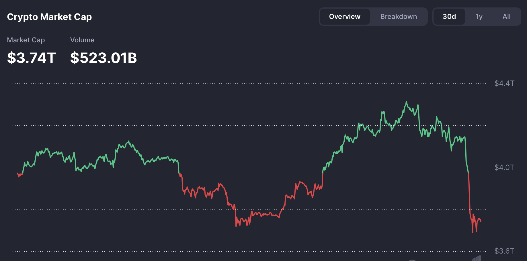 データによると、暗号市場の総時価総額は24時間で9.45%急落し、$3.74兆に達しました。上位200の暗号通貨を追跡するCMC200インデックスもほぼ同じく9.66%下落し、市場全体の売り圧力を反映しています。アナリストは、貿易緊張の高まりが世界経済の減速を引き起こす可能性への恐れから、トレーダーがリスク資産を清算したことが同期した下落の要因であるとしています。
