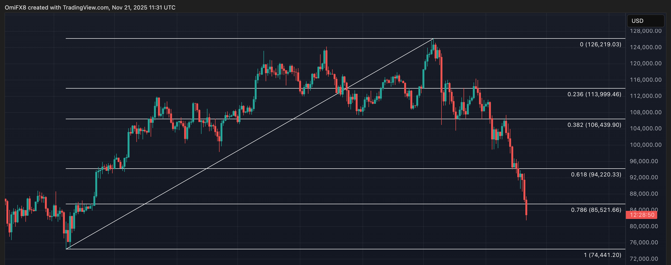 約81,000ドルへの下落により、BTCは4月の75,000ドルから10月初めの126,000ドルを超えるまでのラリーの80%を戻しました。価格は0.786フィボナッチリトレースメントレベルを下回り、次の主要なサポートは約75,000ドルで見られます。