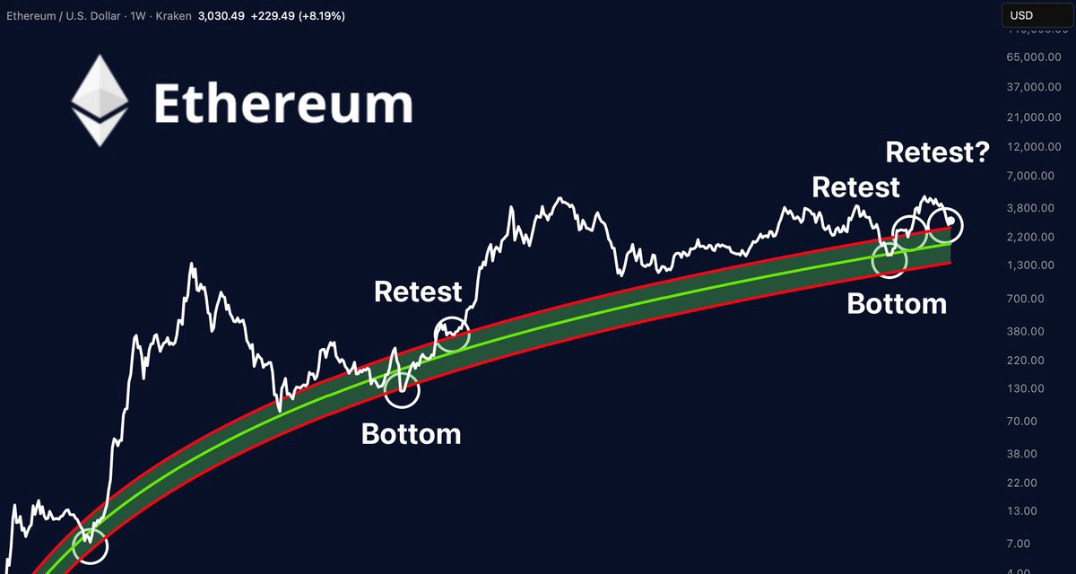 画像は以前の底値と再テストを明確に示しており、ETHが最も強力な反発を開始する前に緑のバンドに繰り返し戻ってきた様子を示しています。最新の価格動向は、その同じ構造上にあり、新しい再テストゾーンの可能性があるとラベル付けされています。意味は簡単です:Ethereumは、サイクルを定義する反転を一貫して生み出してきた同じ長期的なサポートを再訪しています。