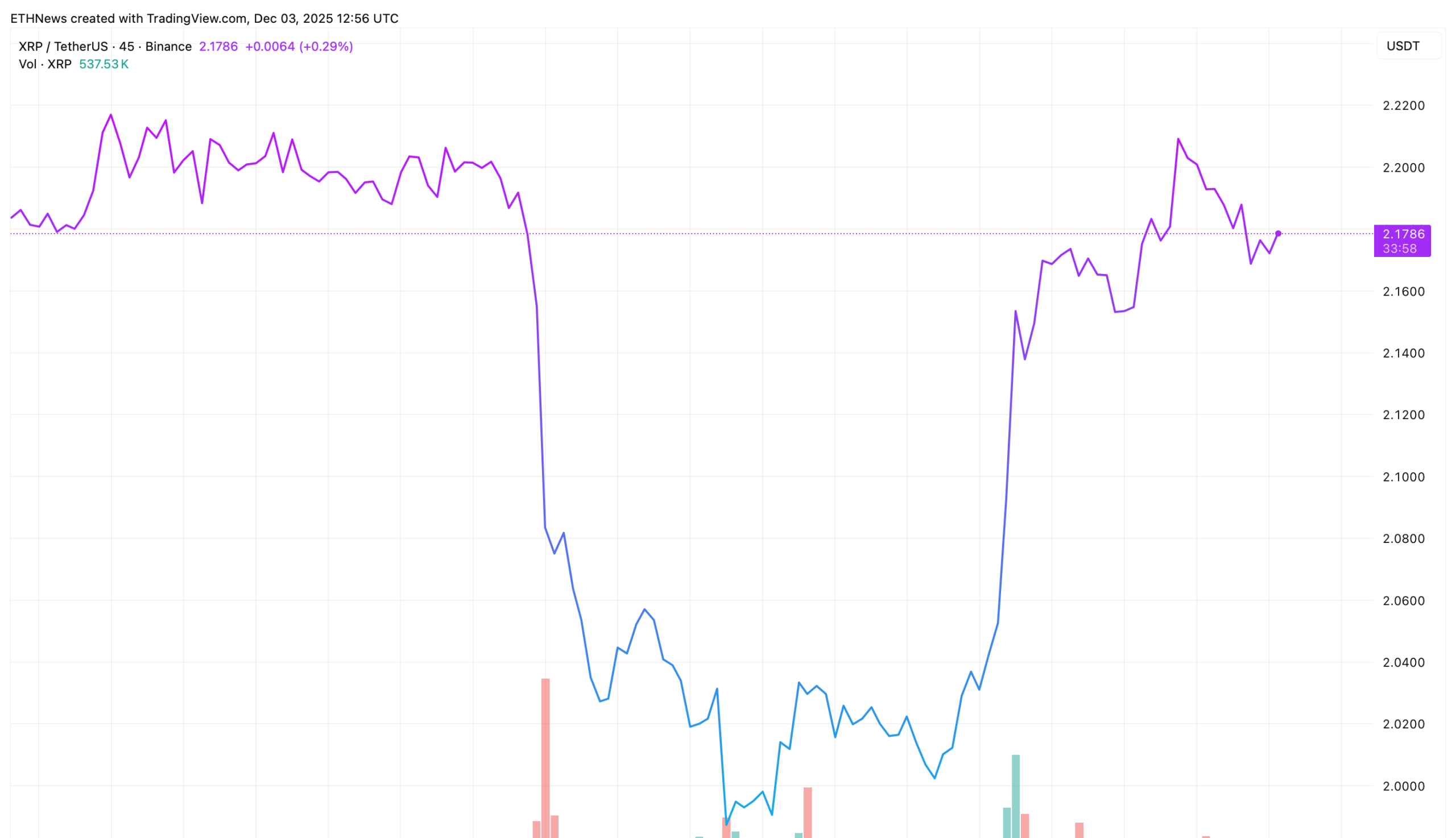チャートでは12月初めに急落が発生し、XRPは1度の高出来高の売りで$2.18超から$2.00未満まで下落しました。この下落は市場全体の急な調整に似ていましたが、$1.98付近で買い手が積極的に参入し、力強い日中の反転を引き起こしました。