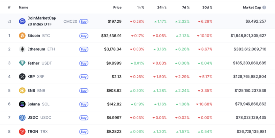 コインマーケットキャップによると、ビットコインは過去24時間で0.05%下落し、92,637ドルで取引された。イーサリアム(ETH)は3,178ドルで日間3.16%上昇した。