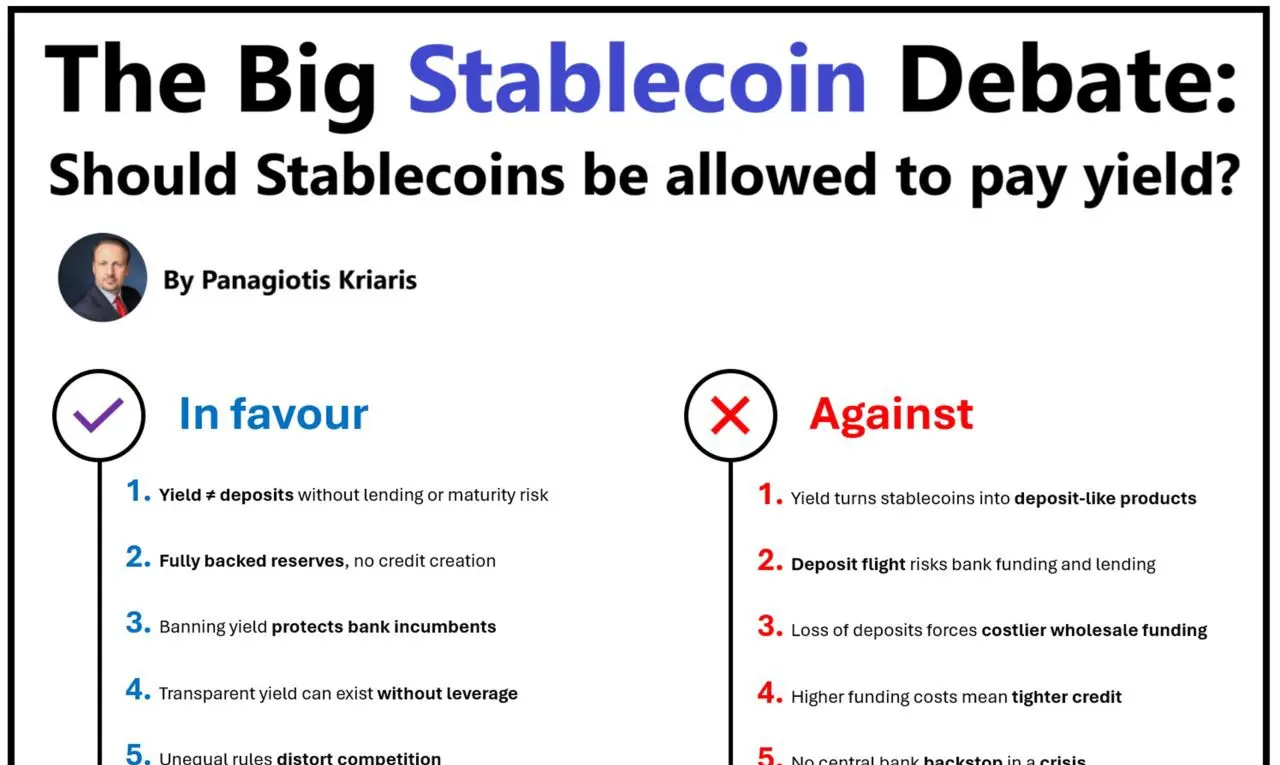 立法者たちが包括的なデジタル資産法案の最終調整を急ぐ中、一つの質問が規制当局、銀行、フィンテック企業、暗号企業を分断しています:ステーブルコインは利回り支払いを許可すべきか?