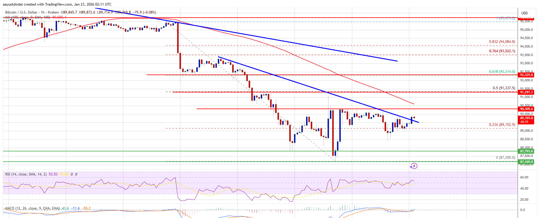 $95,475の高値から$87,200の安値までの下降動きの23.6%フィボナッチリトレースメントレベルを超える動きがあった。さらに、1時間チャートの抵抗線$89,700を超える短期的な下降トレンドラインのブレイクも見られた。ビットコインは現在$90,500および100時間単純移動平均線を下回っている。