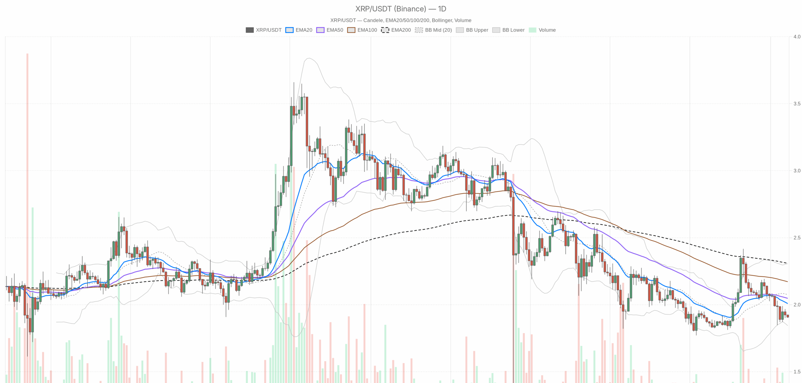 XRP/USDT — 日足チャート(ローソク足、EMA20/EMA50、出来高)