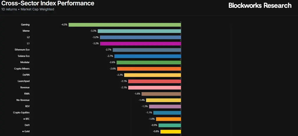 Crypto sectors painted a sea of red. Gaming (-4.5%) led declines, followed by Meme (-3.3%), L2 (-3.2%), and L1 (-3.2%), a notable reversal in higher-beta categories that had outperformed earlier in the month. Ethereum and Solana ecosystems (both -2.7%) also lagged, as network activity slowed and profit-taking intensified post-recent rallies. The one bright spot was AI (+3.5%), which bucked the trend amid renewed enthusiasm for decentralized compute narratives and broader tech strength.