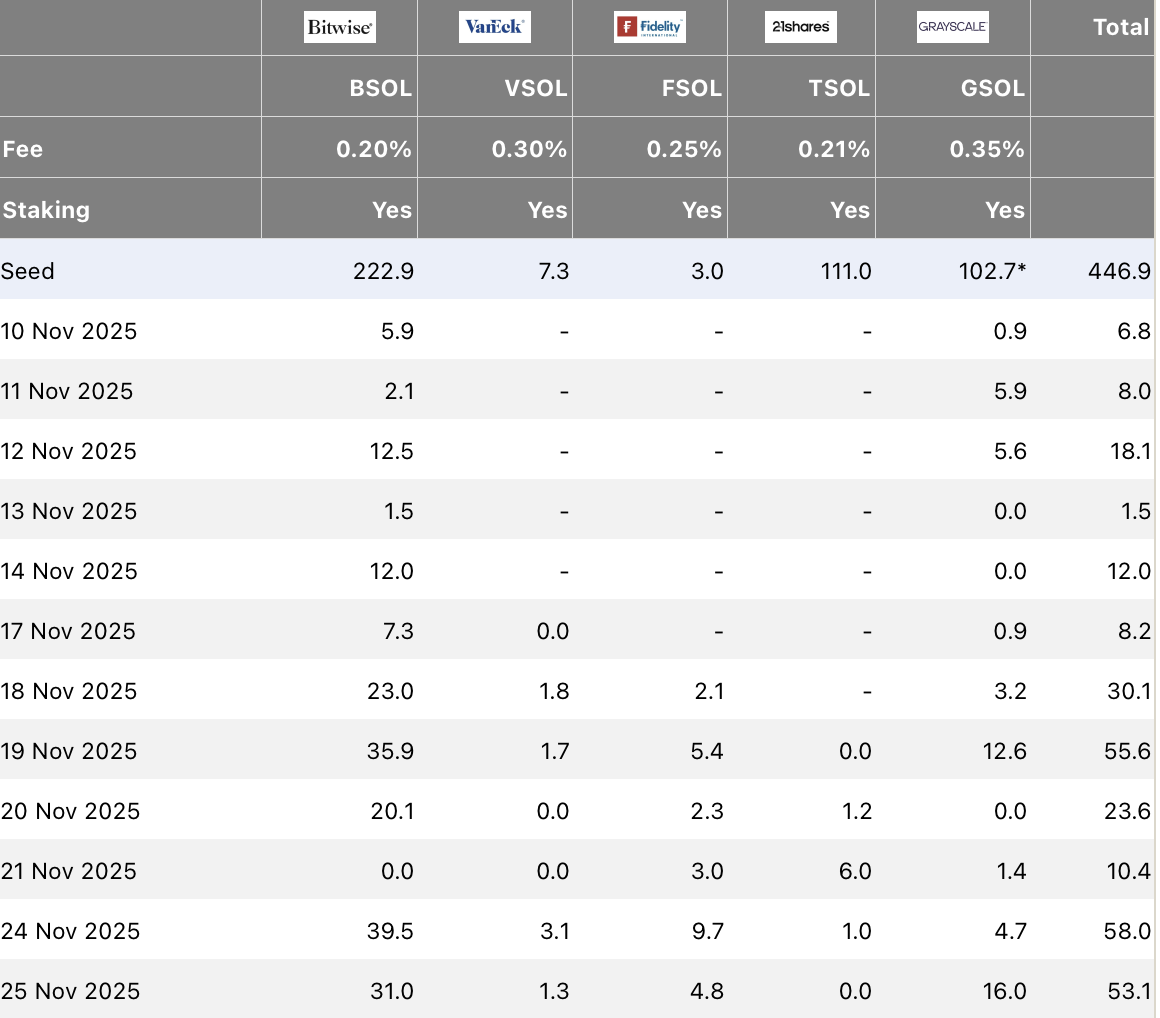 この日の$8.1-$8.2百万の純流出は、ほぼ完全に21Shares Solana ETF (TSOL)によって引き起こされ、$34 百万以上の償還がありました。この突然の引き出しは連勝を破りましたが、セクター全体の関心の喪失を示すものではありませんでした。Bitwise Solana Staking ETF (BSOL)を含む他のファンドは、新しい資本を引き続き惹きつけており、TSOLによる下落を部分的に相殺しました。