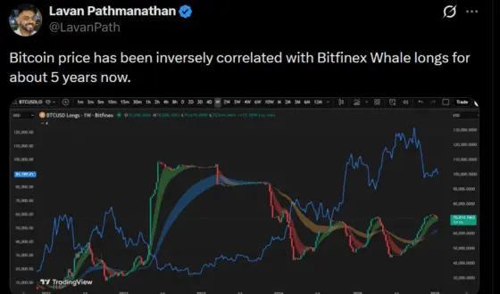 Digital Asset( and Virtual Asset) market analyst Ravan Patmanathan claimed on the 20th( local time via social media X that Bitcoin prices and Binance whale long positions have shown an inverse correlation over the past five years. According to the published chart, there has been a recurring pattern where Bitcoin prices adjust after a surge in large long positions on Binance.