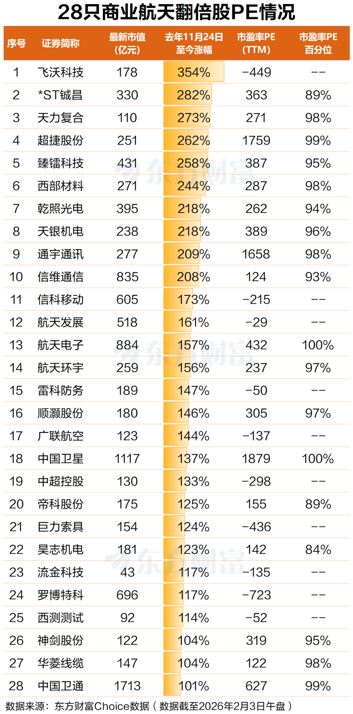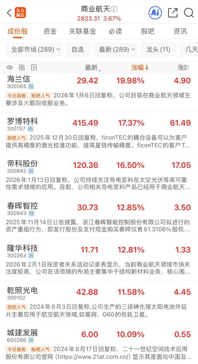 In A-shares, according to data from Eastmoney Choice, since November 24, 2025, the concept of commercial space has remained active. As of the midday trading on February 3, 2026, the overall increase in the concept reached 49%, with 28 constituent stocks doubling in price. However, it is worth noting that this sector is still largely in the concept and theme stage. Investors should be aware of the potential for increased volatility after rapid rises, as well as the pace of future fundamentals realization. Long-term performance of the sector remains to be verified.