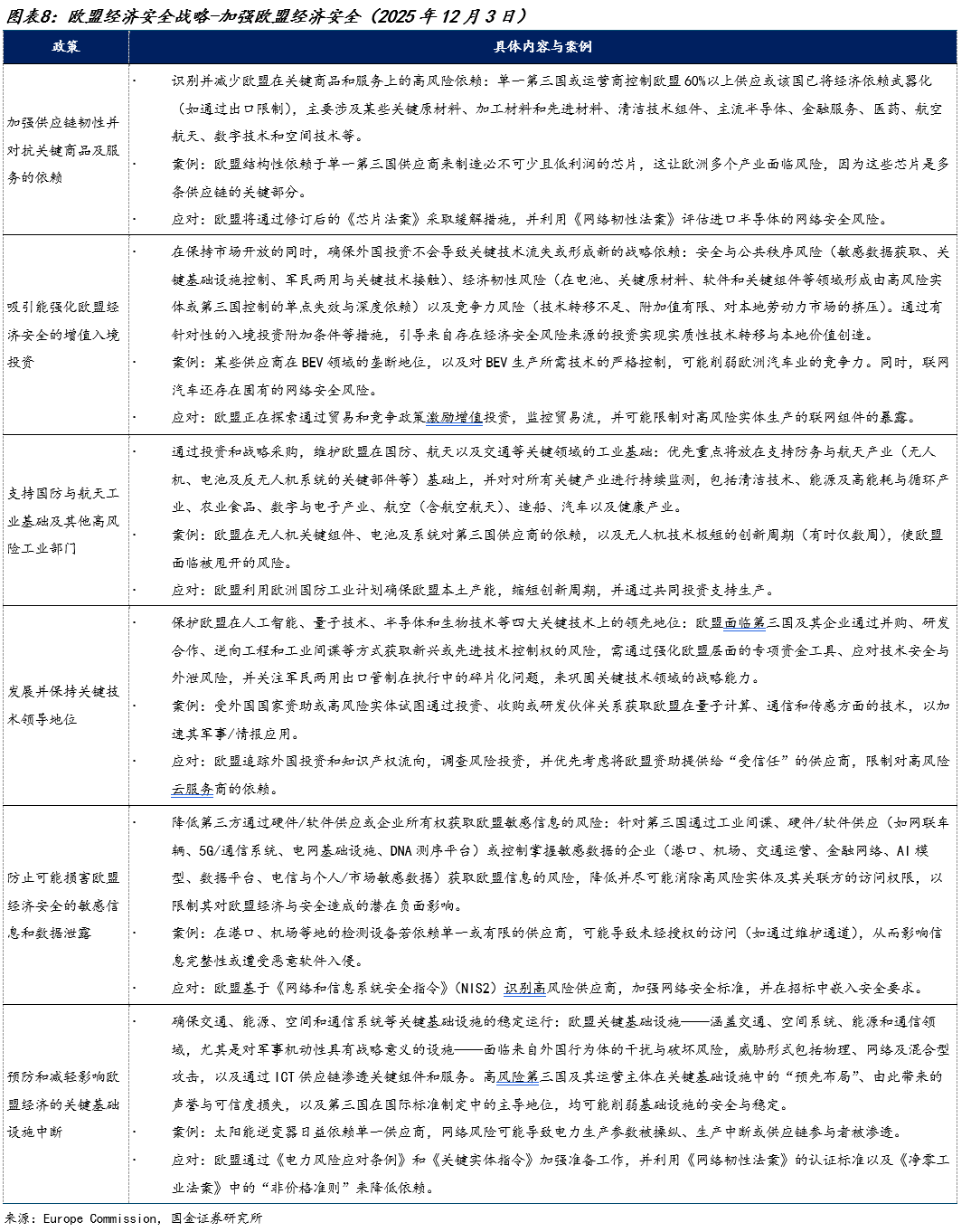 Trade remedy tools are mainly short-term buffers and cannot fundamentally revitalize the EU industrial system. Against this backdrop, the EU updated its economic security strategy at the end of 2025, marking a shift from principle-based “de-risking” to a more operational phase of risk assessment and resilience governance.