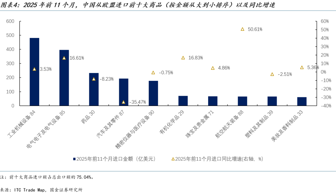 As China’s second-largest import source after ASEAN, the EU’s exports to China in the first 11 months of 2025 show a strong “high-end supply” characteristic, highly concentrated in industrial equipment, technological systems, and high-value intermediate goods.