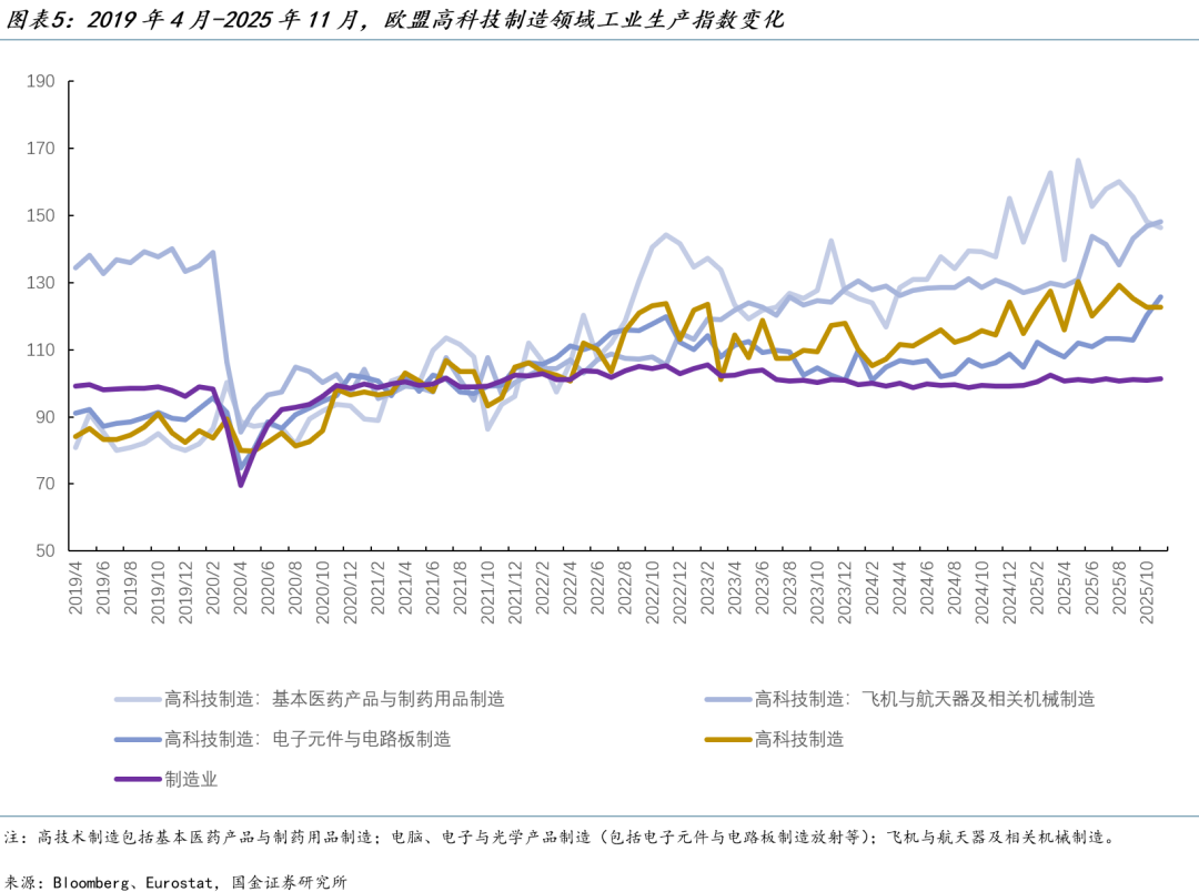 In 2025, several EU high-tech manufacturing sectors’ industrial production indices (IPI) hit new highs in recent years, demonstrating high synchronization with China’s increased imports. For example, the EU’s aircraft and spacecraft manufacturing IPI reached its highest point in nearly six years in November, precisely when China’s imports of high-thrust turbofan engines doubled. Similarly, the index for electronic components and circuit board manufacturing rose to a historic high of 125.6 in November, directly supporting China’s procurement of high-end EU integrated circuits.