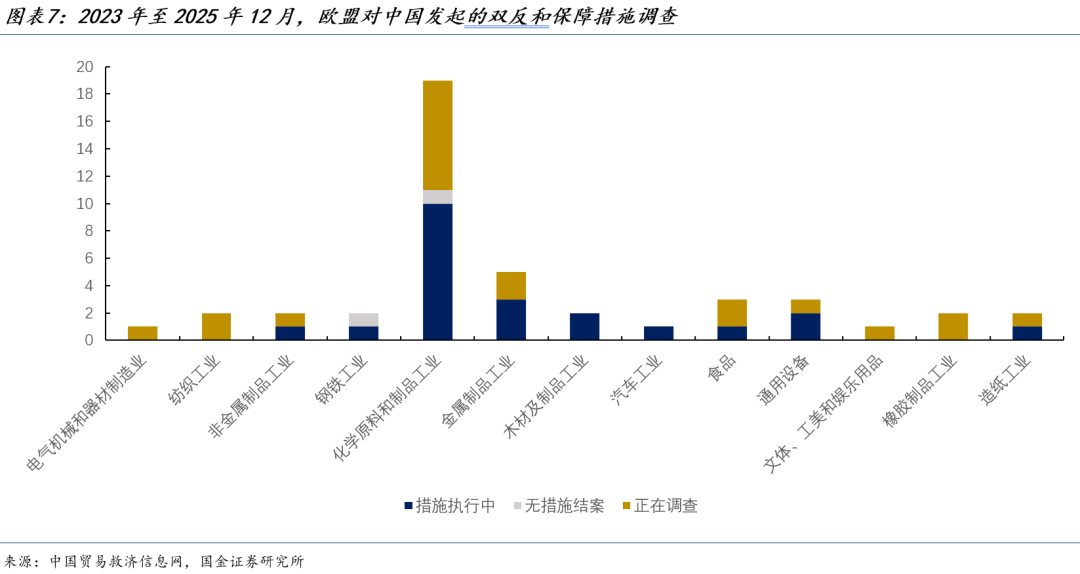 In this context, the EU has increasingly used anti-dumping, anti-subsidy, and other trade and competition policies to buffer external shocks and protect its industrial base. For example, since 2023, the EU has initiated 45 anti-dumping, anti-subsidy, and safeguard investigations against China, mainly in chemical raw materials and products (19 cases) and metal products (5 cases), with 22 cases in enforcement and 21 under investigation.