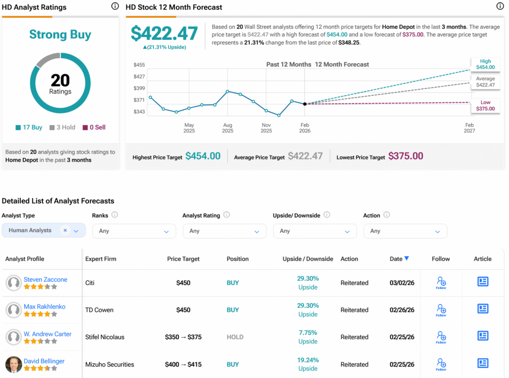 Turning to Wall Street, analysts have a Strong Buy consensus rating on HD stock based on 17 Buys and three Holds assigned in the past three months, as indicated by the graphic below. After a 4.47% loss in its share price over the past year, the average HD price target of $422.47 per share implies 21.31% upside potential.