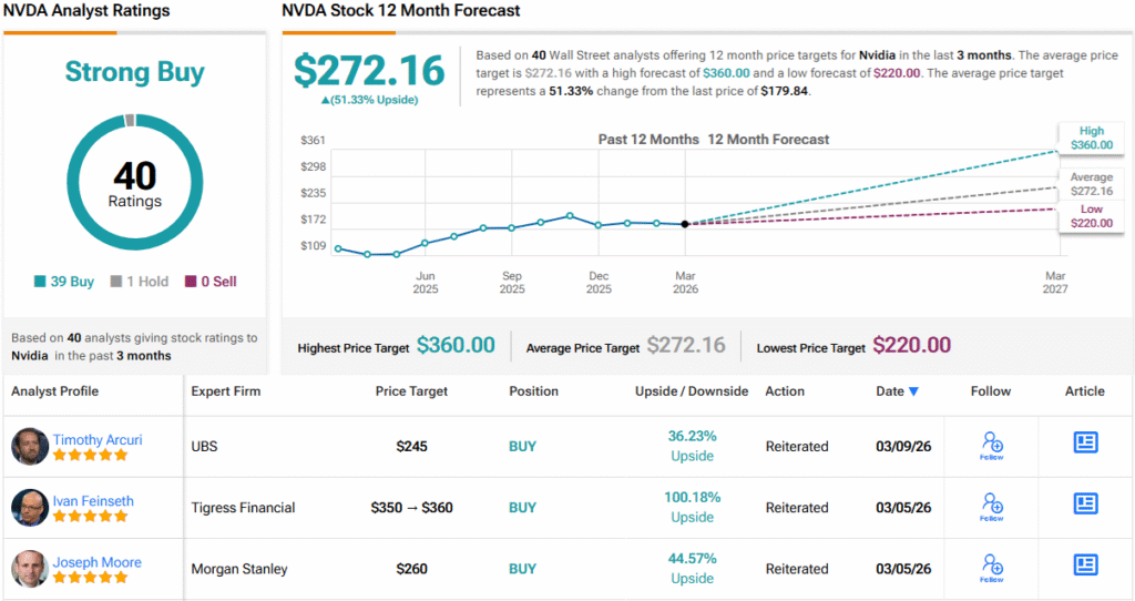 Almost all of Feinseth’s colleagues back that stance; based on a mix of 39 Buys vs. 1 Hold, the stock claims a Strong Buy consensus rating. Going by the $272.16 average price target, a year from now, shares will be changing hands for a 51% premium. (See Nvidia stock forecast)