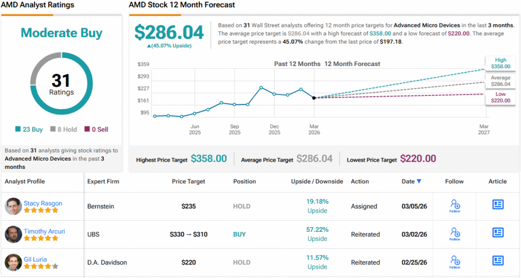 7 other analysts also remain AMD skeptics, but with an additional 23 Buys, the analyst consensus rates the stock a Moderate Buy. The forecast calls for a one-year share appreciation of 45%, considering the average price target clocks in at $286.04. (See AMD stock forecast)