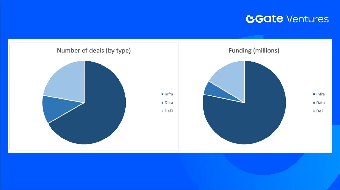 Last week, eight funding rounds were completed, with infrastructure (Infra) accounting for 6 deals (75%). DeFi and Data each had one deal.