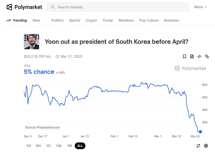 Durante o impeachment do presidente Yoon Suk-yeol em 2025, diversos contratos ligados à política coreana surgiram na Polymarket, atraindo atenção midiática. A imprensa coreana definiu a Polymarket como “toto privado ilegal”, destacando que, segundo a lei, coreanos que apostam em mercados de previsão podem ser punidos por jogo de azar.