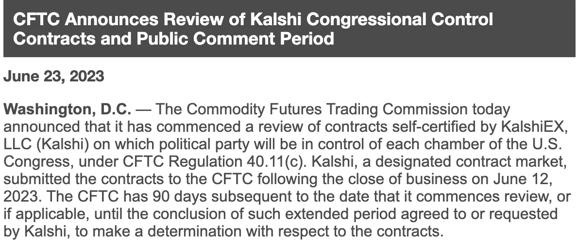 Ao autohomologar e lançar mercado sobre controle do Congresso em junho de 2023, a CFTC alegou que esses mercados eram apostas ilegais segundo leis estaduais e contrários ao interesse público. A Kalshi acionou a justiça federal em novembro e venceu em setembro de 2024. Após retirada da CFTC, ficou livre da pendência regulatória.
