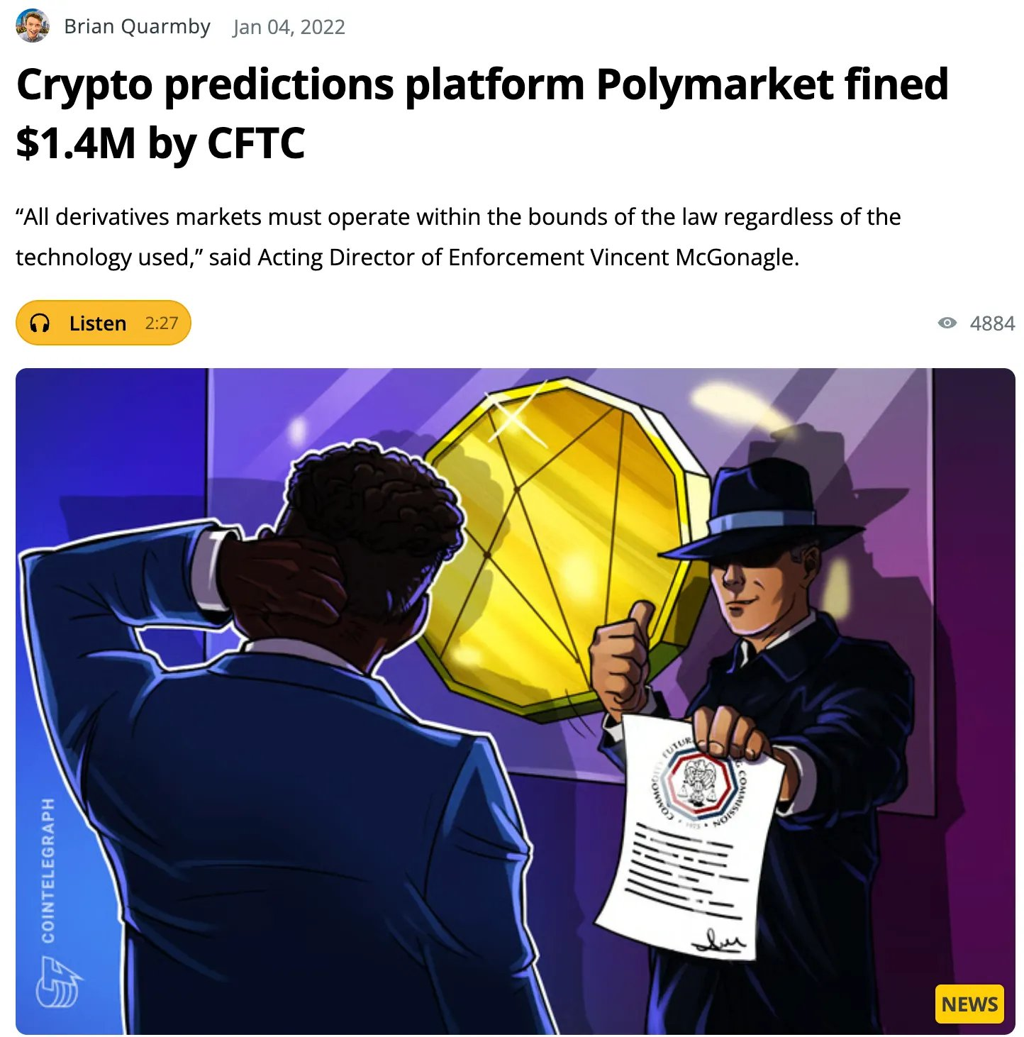 A Polymarket cresceu rapidamente após o lançamento em junho de 2020, mas em janeiro de 2022 foi alvo de ação da CFTC, pagando multa de US$ 1,4 milhão e bloqueando usuários dos EUA por operar como exchange não registrada. Depois disso, a Polymarket operou apenas fora dos EUA por dois anos. A CFTC classificou os serviços da Polymarket como ‘swaps’ conforme o CEA, só podendo ser ofertados em exchanges DCM ou SEF.