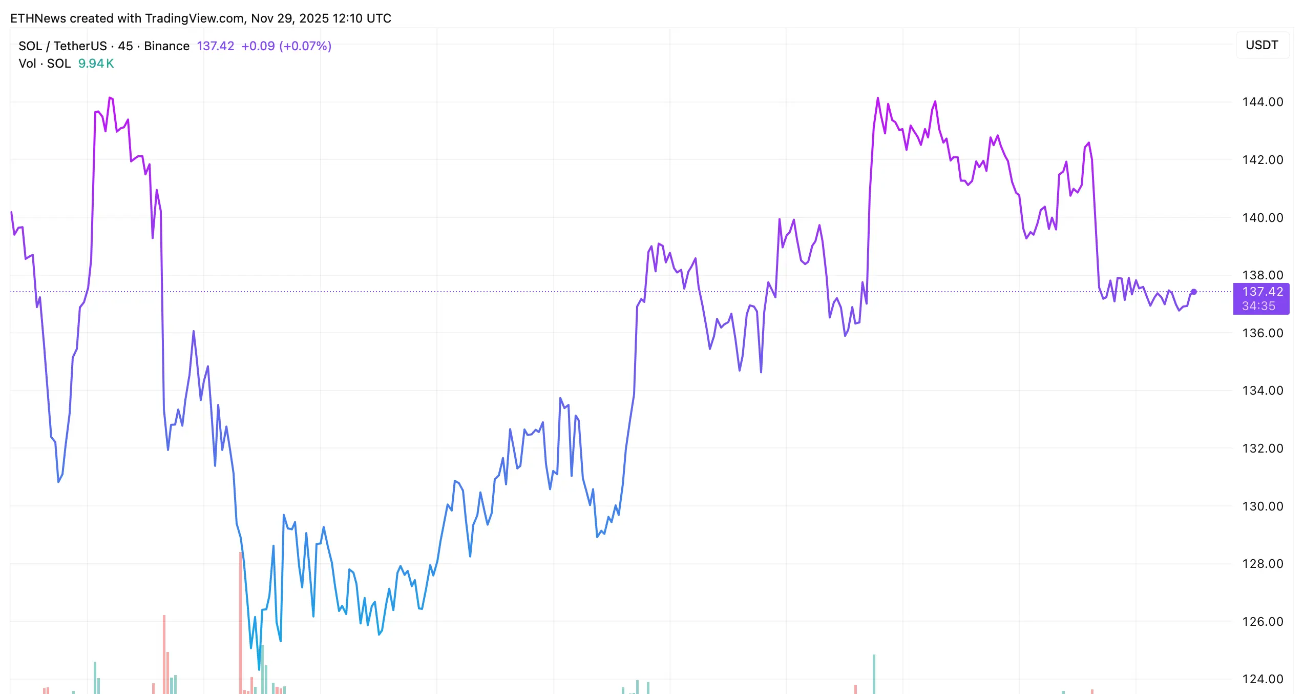 Estabilização entre $137 e $142: Após as resgates do TSOL, o gráfico reflete resiliência, o SOL manteve sua faixa recuperada e continuou a negociar perto de $138-$140.