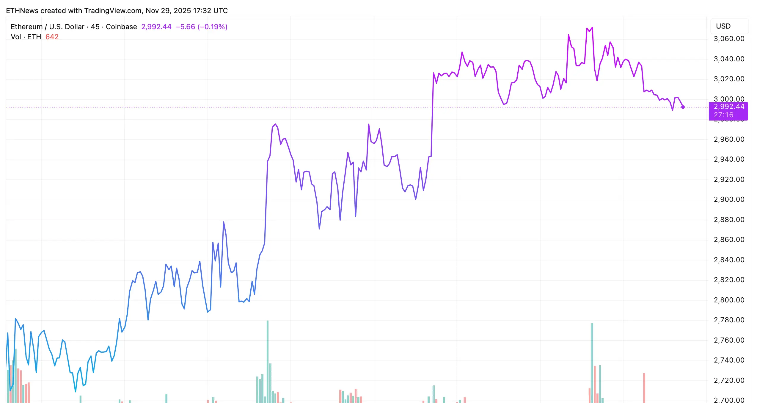 O gráfico de 5 minutos ( de curto prazo mostra o ETH a negociar entre $2,990 e $3,020, após múltiplas oscilações intradiárias com volatilidade em declínio. Embora ainda esteja agitado, a estrutura está a formar um padrão de estabilização arredondada, indicando que os vendedores estão a perder impulso após um movimento agressivo no início da semana.
