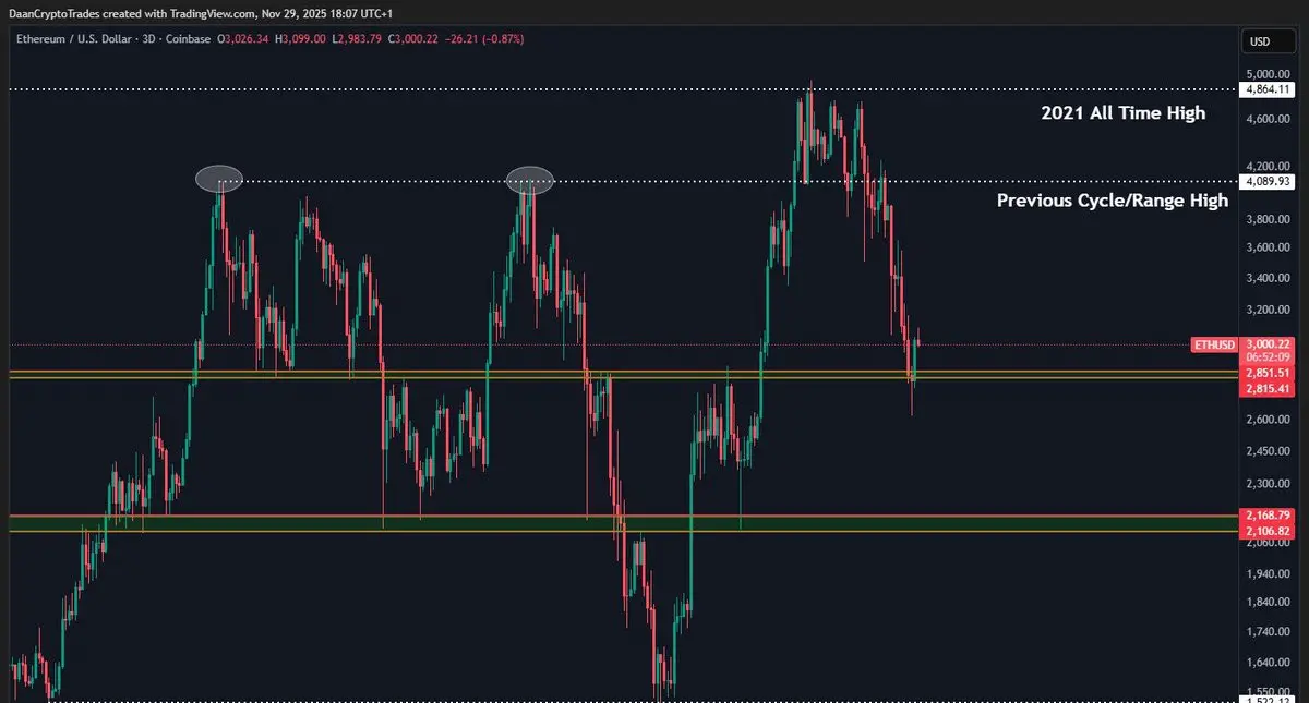 O fechamento semanal está se mostrando muito mais forte do que muitos traders esperavam, já que o ETH continua a defender uma faixa de suporte importante entre $2,850 e $3,350, uma zona destacada pelo analista de mercado DaanCrypto como essencial para manter o momento altista.