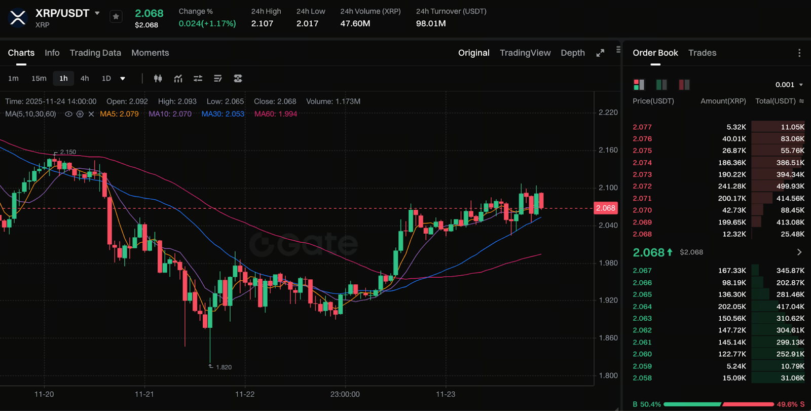 O gráfico pode ser consultado em https://www.gate.com/trade/XRP_USDT