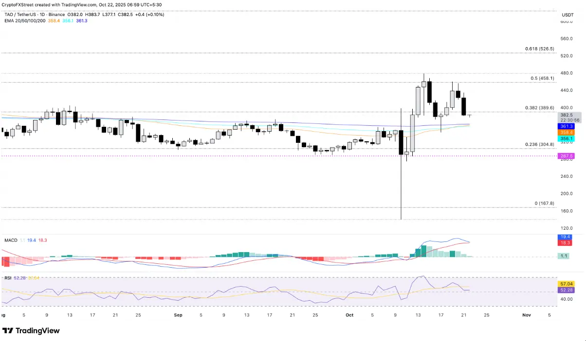 A região de 361 USD atualmente desempenha o papel de suporte fundamental, onde convergem as médias móveis exponenciais (EMA) de 50, 100 e 200 dias. Se esse nível for rompido, o TAO pode ampliar a tendência de queda para a região de 304 USD, correspondente ao nível de retração de Fibonacci de 23,6%.