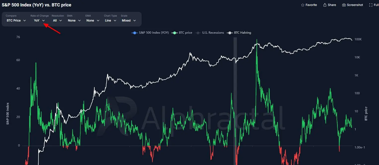Alphractal está integrando essa lógica visual diretamente em sua suíte de análises. Os usuários poderão aplicar filtros de taxa de variação, YoY, QoQ, MoM e mais, a uma ampla gama de métricas, incluindo indicadores macroeconômicos, sentimento e atividade on-chain.