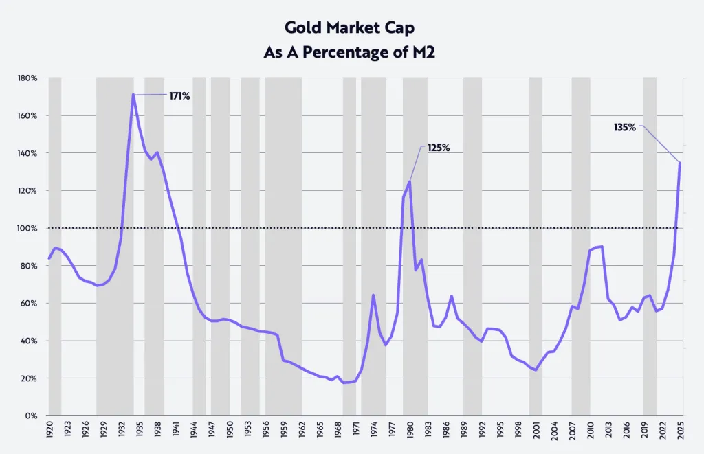 Ela também destacou que a última corrida do ouro atingiu níveis historicamente extremos. A relação entre a sua capitalização e a massa monetária M2 voltou aos níveis do início dos anos 1930 e 1980, o que no passado foi um prenúncio de alta rentabilidade do mercado de ações após uma correção.
