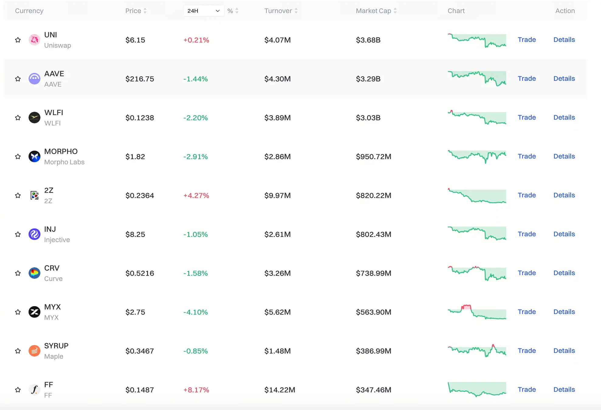 Сектор токенов DeFi продолжает испытывать слабость. UNI слегка вырос на 0.21%, AAVE упал на 1.44%, WLFI и MORPHO упали на 2.2% и 2.91% соответственно, что показывает, что токены голубых фишек сильно подвержены макроэкономическим колебаниям. В то же время, FF вырос на 8.17%, став одним из немногих проектов, которые идут против тренда, что может быть связано с активностью на коротком сроке и событиями в блокчейне.