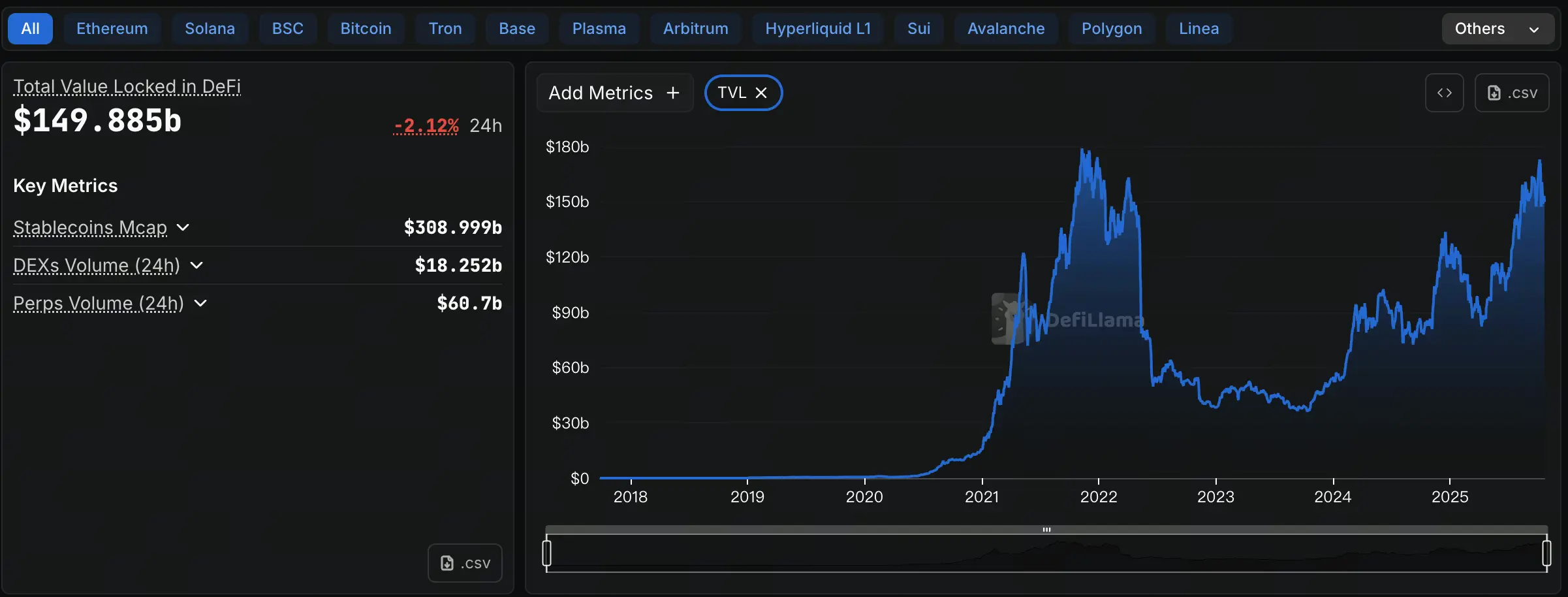Общий TVL DeFi: Сегодня (22 октября) криптовалютный рынок после большого дампа золота испытал волну отдачи, BTC на время поднялся до 114000 долларов. Однако эта тенденция не смогла сохраниться, и на момент публикации BTC откатился до 108000 долларов, ETH колебался около 3850 долларов; общий TVL DeFi упал ниже отметки в 150 миллиардов долларов и составляет 149.885 миллиарда долларов, снижение за 24 часа составило 2.12%.