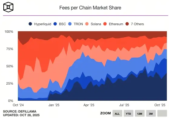 В этом году модель затрат, связанная с основными Layer-1 Блокчейн, претерпела значительные изменения. В начале года доля交易費 Solana на основных L1 платформах превышала 50%, но сейчас составляет всего 9%, что является падением на 82%. Главная причина такого резкого снижения — это жесткая конкуренция со стороны Hyperliquid и BNB Chain.