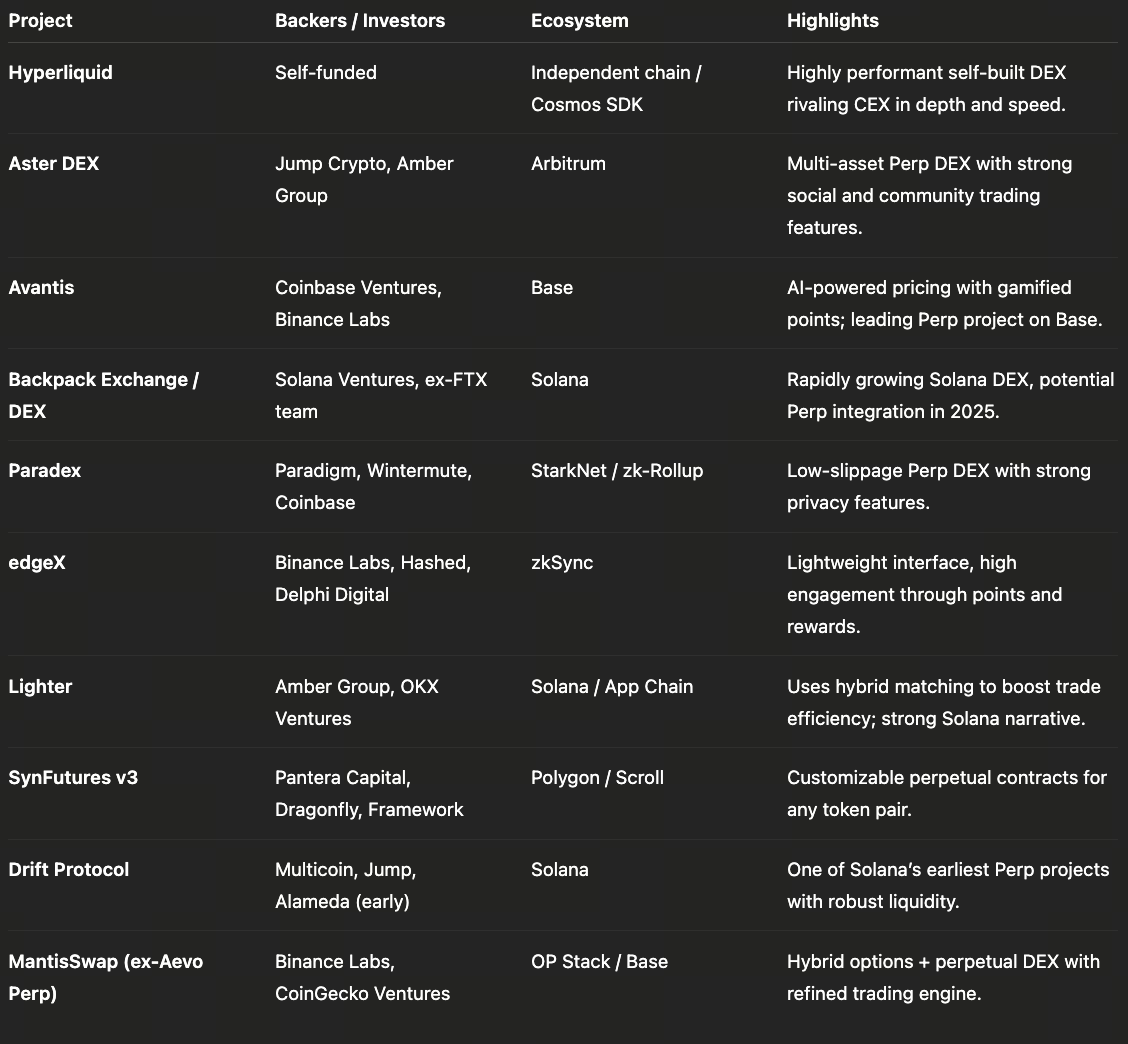 Each project has a distinct backer and ecosystem profile. Binance-aligned projects (Aster, StandX) have deep resources; Amber Group (edgeX) is an Amber incubatee; Paradigm projects (Paradex) trace to the Paradigm team; Solana ecosystem (Jupiter, Drift, Bulk, Backpack, Lighter, etc.) projects cluster around Solana; Base ecosystem (Avantis) leads derivatives on Coinbase’s Base; Others like Hyperliquid are fully proprietary; Orderly is supported by OKX Ventures, Pantera, Longhui, Sequoia, and other top investors. The chart below details each project’s main alliances and notes: