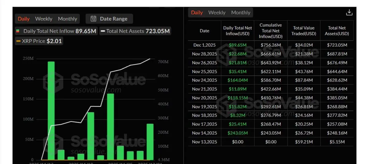 Total net assets across all XRP ETFs now stand at $723.05 million, a level that reflects both sustained investor interest and strengthening market conditions. The momentum accelerated at the start of the week, with $89.65 million entering the products on Monday alone. The leading XRP ETF products continued to lead the day’s activity, followed by continued participation from other major funds.